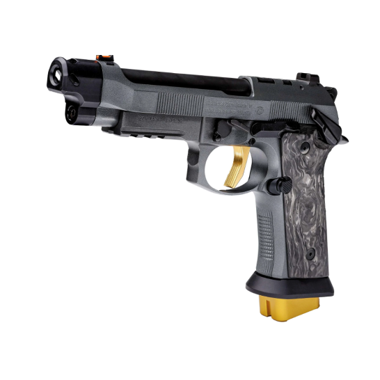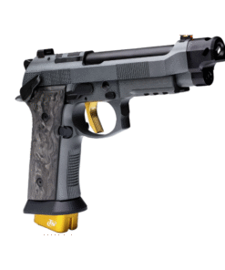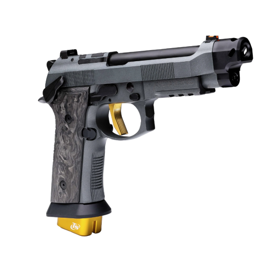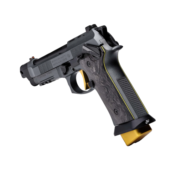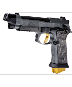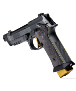 Introducing The 92XI SAO CORSA, the pinnacle of race competition pistols, exuding the same exhilarating energy as a high-end race car tearing down the track. Crafted with precision and finesse, this masterpiece features luxurious gold-colored accents that elevate its aesthetic to unparalleled levels of elegance and performance. With its X-treme S Trigger, boasting DLC coated components and a lightweight skeletonized hammer, every shot is executed with unparalleled smoothness and precision. Equipped with three magazines featuring extended base pads for a total of 22 rounds, the Corsa ensures you’re always ready to dominate the competition. Its frame-mounted safety, optics mounting for MRDS sights, and aggressive checkered frame provide unparalleled control and accuracy. The LOK Grips marbled carbon fiber grip panels have a striking yellow outline that add a touch of sophistication. With features like the Toni System Magwell and Single Port Toni System Compensator, the Corsa is engineered for ultimate performance on the race circuit. Experience the thrill of victory with the 92XI SAO Corsa—where precision meets prestige.