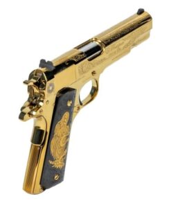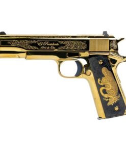 The Limited Edition Colt 1911 El Presidente De Oro stands as the pinnacle of collector’s treasures. Its slide and frame gleam with a high-polished gold titanium nitride finish, embellished with elaborate scroll and lace accents featuring “El Presidente” above “1911 de Oro,” along with the Colt logo, presidential crest, Rampant Colt, and silver embossed 38 Super casing. Adding to its opulence, the custom blued metal engraved grips are adorned with a 24-carat gold plated Mexican Coat of Arms.