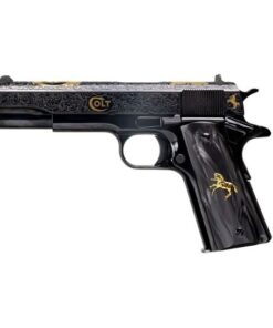 The Colt 1911 Government Limited Edition with only 500 made is chambered in .38 Super, a timeless classic redefined for the modern shooter. Crafted with precision, this iconic pistol features a 5″ barrel and a steel frame for durability and accuracy. Equipped with a blade front sight and fixed rear sight, every shot hits the mark with pinpoint precision. With a 9-round capacity, the Colt 1911 Government ensures you’re always prepared for any situation. Elevate your shooting experience with the elegant touch of black Pearlite grips and custom engraved gold inlays, making every moment on the range or in the field truly unforgettable. Experience the epitome of performance and style with the Colt 1911 Government. Order now and own a piece of firearm history.