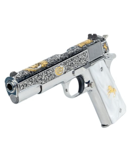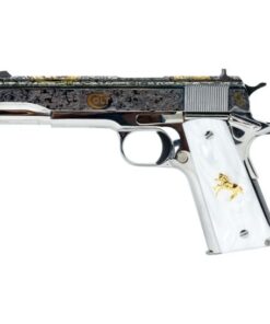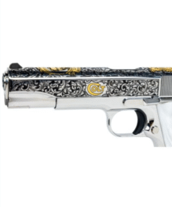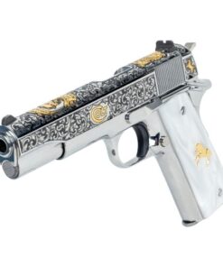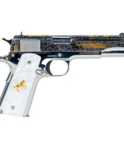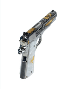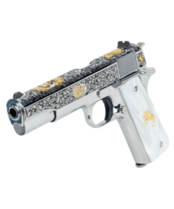 Adding to its allure are the exquisite embellishments, including gold inlays and engravings, which adorn the frame, elevating its visual appeal to new heights. The pearl grips offer a comfortable and secure hold, ensuring maximum control and accuracy with every shot.