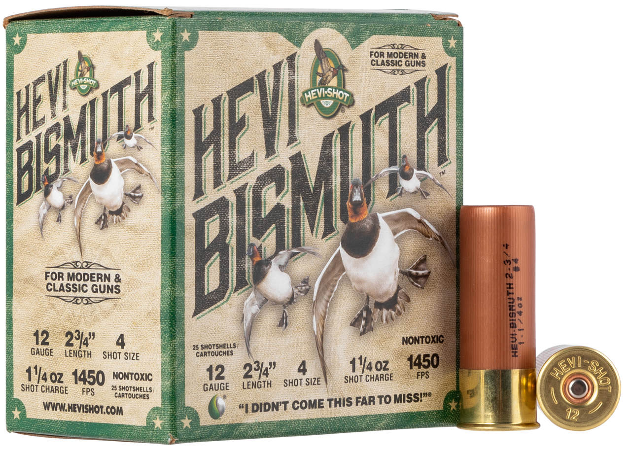 HEVI-Bismuth Waterfowl shells utilize bismuth, which is 22% denser than steel, to deliver more downrange lethality at an affordable price. And, its safe for older fixed choke and fine classic doubles shotguns.