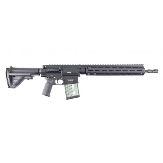 Like its 5.56 mm counterpart, the MR762A1 is a direct descendent of the HK416/417 series, only in a semi-automatic rifle configuration developed for civilian users. Using the HK-proprietary operating system, the MR762A1 is gas operated and uses a piston and a solid operating “pusher” rod in place of the common gas tube normally employed in AR15/M16/M4-style weapons. Pioneered by Heckler & Koch in the G36, HK416, and HK417; this method virtually eliminates malfunctions common to direct impingement gas systems since hot carbon fouling and waste gases do not enter the receiver area. The MR762A1 stays cleaner, reducing heat transfer to the bolt and bolt carrier, and drastically reducing wear and tear on other critical components. The service life of all parts is increased substantially.