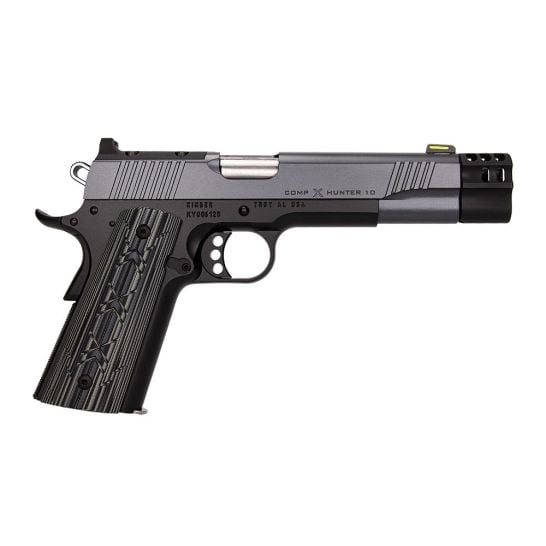 The COMP X Hunter is Kimber’s first-ever production compensated 1911, designed specifically for modern pistol hunters and shooting enthusiasts. Chambered in hard-hitting 10mm, this innovative pistol features a patent-pending compensator that reduces recoil and muzzle rise for enhanced control and accuracy. A toolless plunger allows for effortless removal and cleaning, ensuring quick maintenance in the field. Built as the first in a limited series of dedicated 10mm hunting pistols, the COMP X Hunter offers an 8-round single-stack magazine, making it a powerful yet compact option for hunting or range use. Each model is optics-ready and fully compatible with Kimber’s optic plate mounting system, providing versatility for a variety of red-dot sights. Finished in a durable gray and black KimPro coating with rugged G-10 grips, this 1911 is built to withstand the harshest conditions while delivering precision and reliability when it matters most.