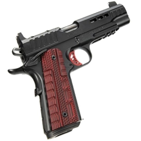 - The frame features aggressive Stiplex texturing on the front strap for enhanced control, red and black G10 grips for a secure hold and a 1913 Picatinny rail to easily mount lights, lasers or other accessories