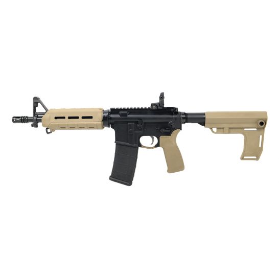 Barrel: Chrome Moly steel. Chambered in 5.56 NATO, with a 1/7 twist, M4 barrel extension, and a carbine-length gas system. Barrel is finished off with a Magpul MOE Carbine FDE handguard, F-Marked gas sight base, and A2 flash hider.