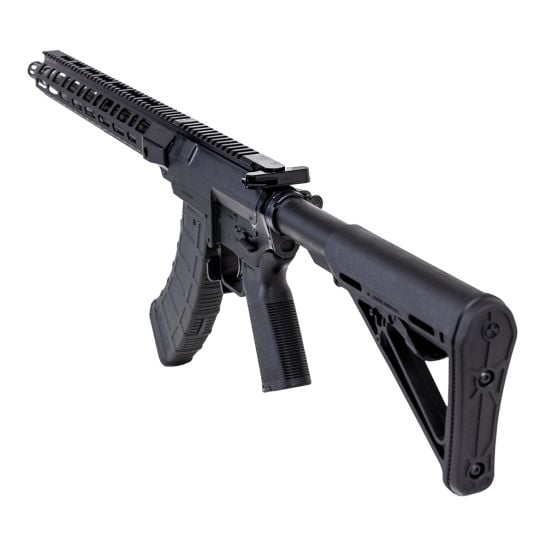 Upper: The KS-47 G2 upper receiver is precision machined out of forged 7075 T6 aluminum, and then hard coat anodized for durability. While retaining the look of a standard M4 upper, the KS-47 G2 upper is designed to work with the new Gen2 KS-47 lower. The upper features integrated over-insertion tabs to prevent the bolt from dragging on the magazine. This CMV 4150 barrel is chambered in 7.62×39 with a 1 in 10 twist and has a single, large feed ramp to accommodate the larger case diameter of the 7.62×39 round. The barrel is nitride treated for accuracy and durability and is finished off with a 5/8-24 thread A2-style compensator. The forward assist, dust cover, charging handle, and safety are all standard AR-15. This KS-47 G2 upper is finished off with a PSA 15″ Lightweight M-Lok Free Float Rail. The KS-47 G2 upper will not work with a standard AR-15 lower.