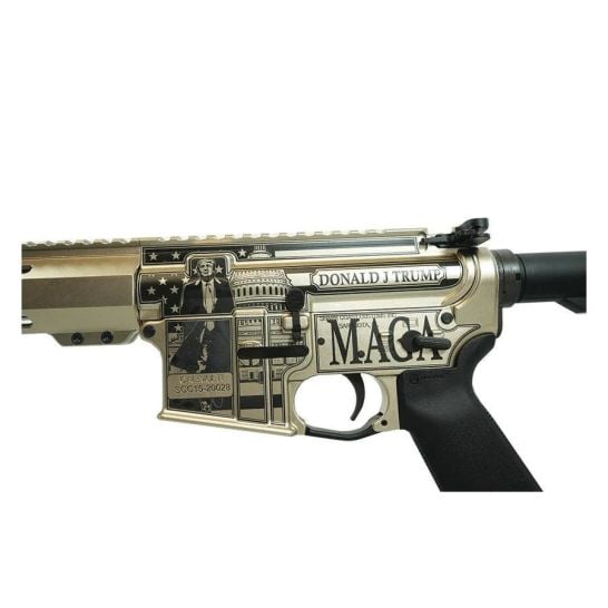 The Trump 3.0 by Shark Coast Tactical is a bold statement of strength and resilience, crafted for those who appreciate both artistry and performance in a firearm. This custom deep-engraved AR is designed to honor presidential candidate Donald Trump, featuring a striking Silver Cerakote FX finish that highlights intricate presidential-themed engravings on both sides of the receiver. Beyond its commanding presence, the Trump 3.0 delivers exceptional reliability and precision, making it a standout addition to any collection. Combining expert craftsmanship with a design that embodies power and prestige, this AR reflects the unwavering commitment to excellence that defines Shark Coast Tactical.